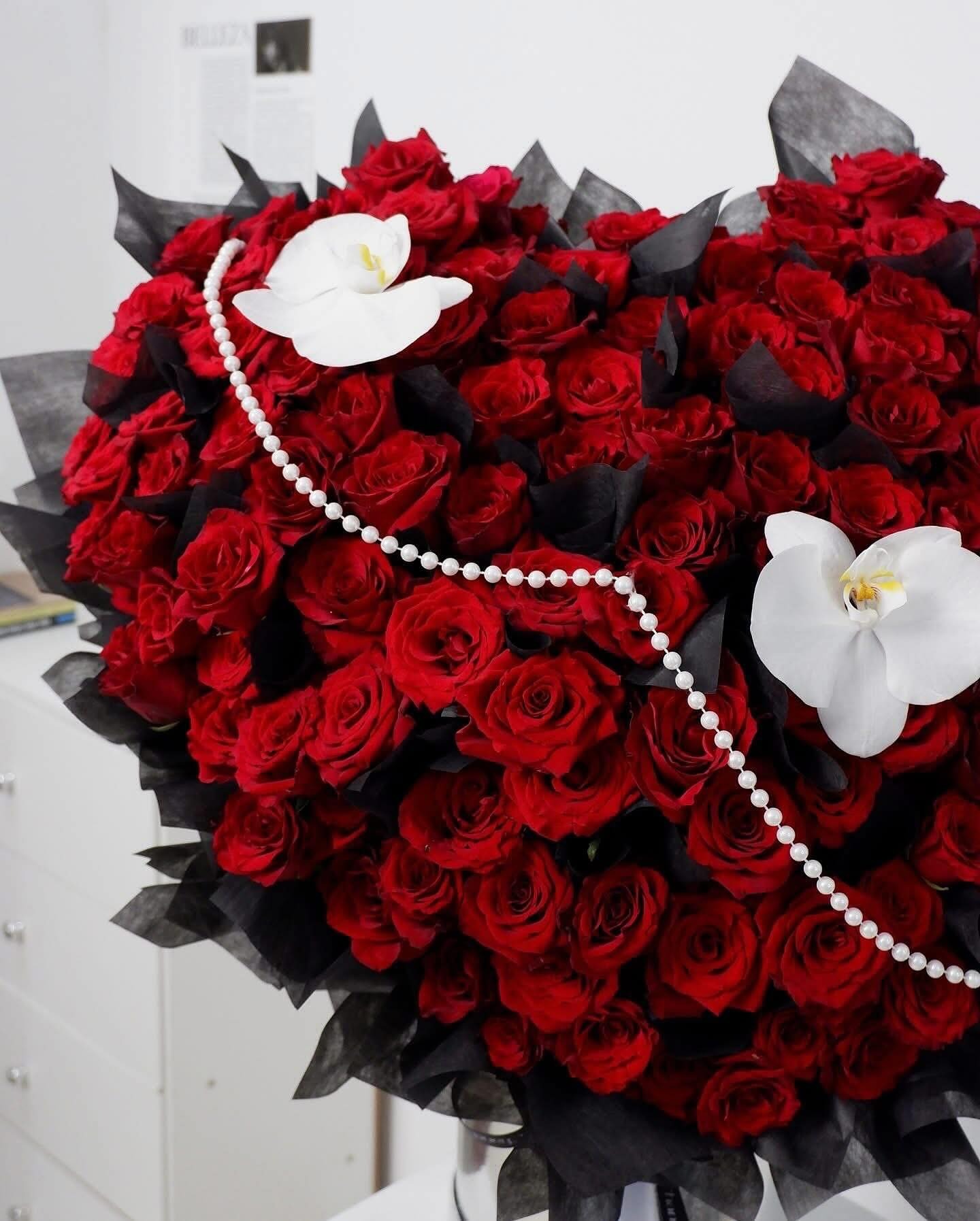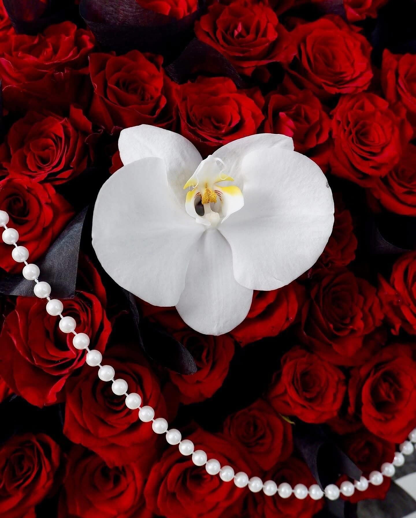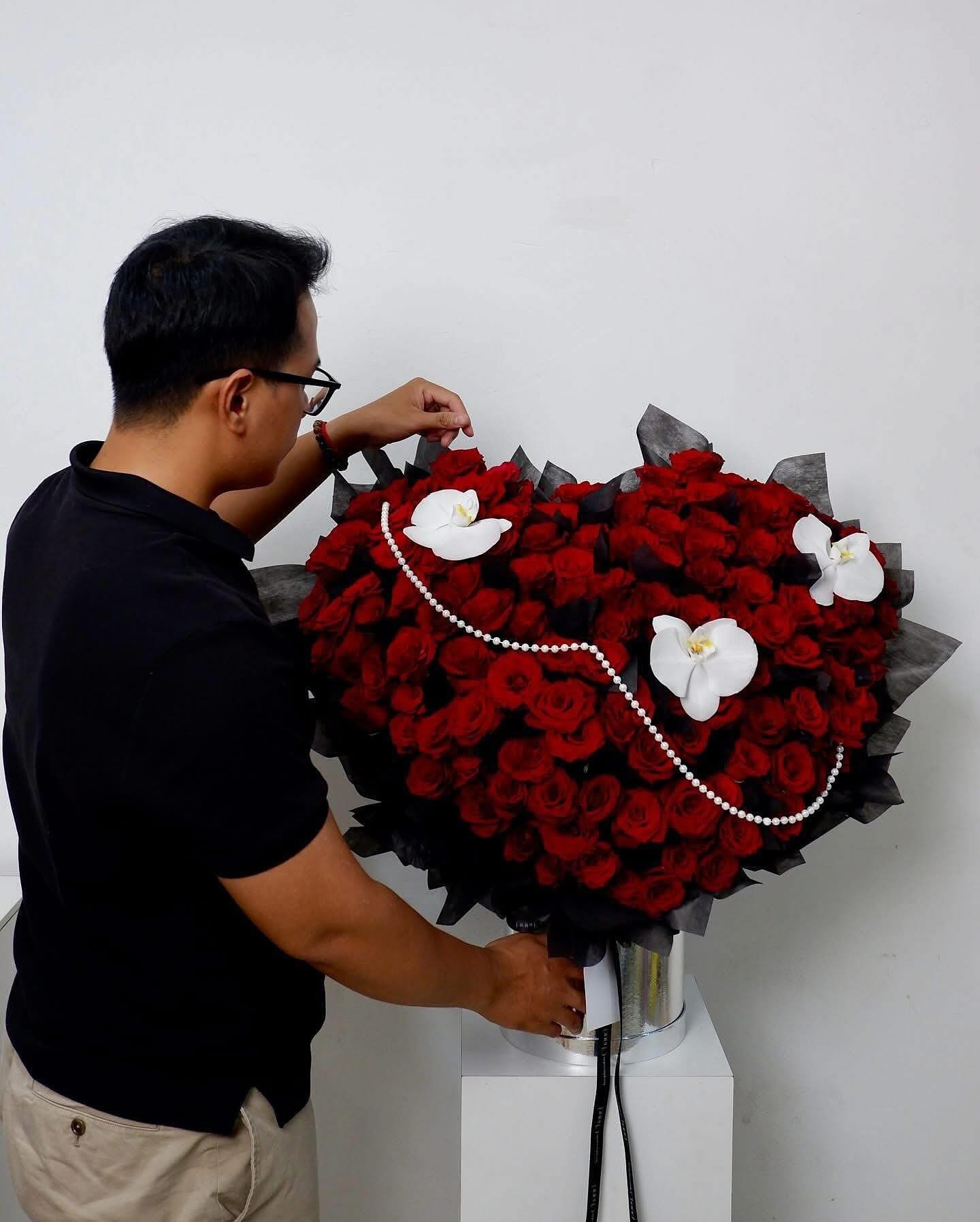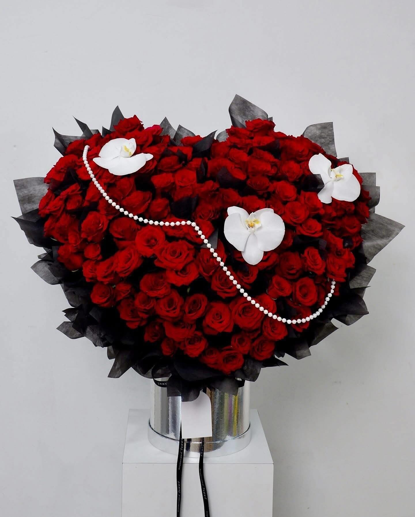 Giỏ hoa trái tim được kết từ những đóa hồng đỏ rực rỡ, sắp xếp dày dặn và chuẩn form, tạo nên tổng thể mạnh mẽ nhưng vẫn tinh tế. Sắc đỏ sâu tượng trưng cho đam mê, sự quyết đoán và cảm xúc trọn vẹn, nổi bật trên nền giấy đen sang trọng. Điểm xuyết lan hồ điệp trắng cùng chuỗi ngọc trai mềm mại giúp giỏ hoa cân bằng giữa nét quyền lực và vẻ thanh lịch, khiến ánh nhìn khó rời ngay từ khoảnh khắc đầu tiên.