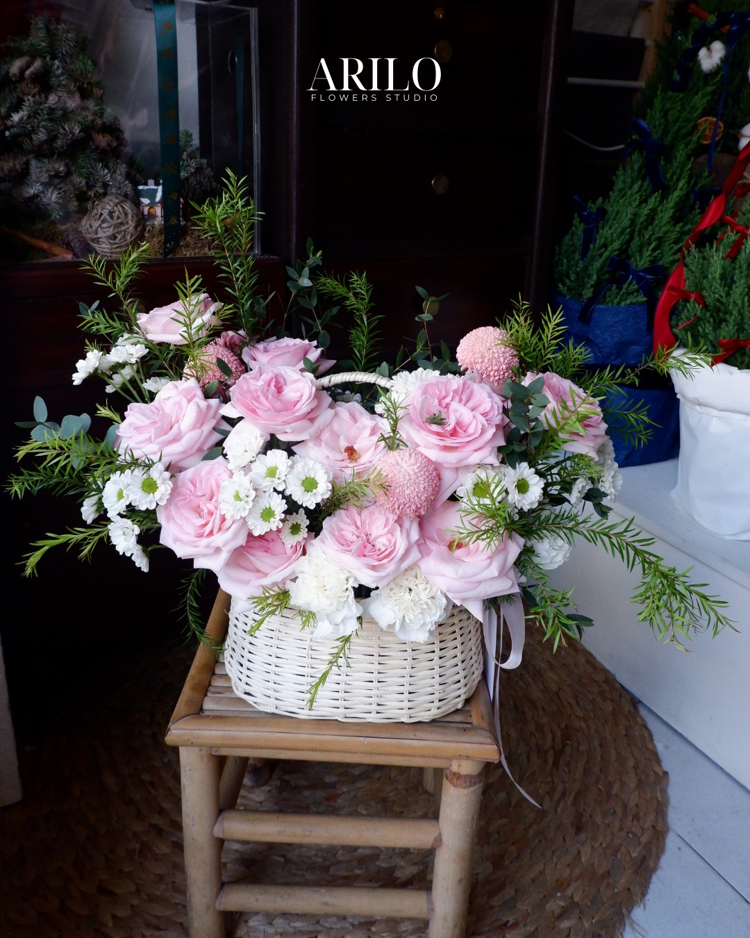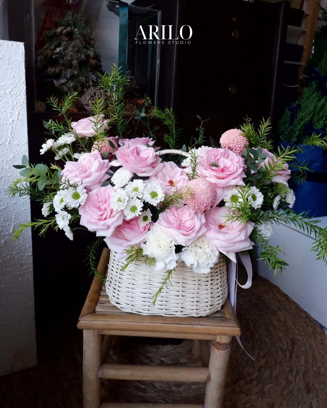 Giỏ hoa trong hình mang phong cách thanh lịch, dịu dàng với tông hồng phấn – trắng chủ đạo, rất phù hợp để gửi tặng trong những dịp khai trương, chúc mừng cửa hàng, văn phòng hoặc không gian kinh doanh mang hơi hướng tinh tế. Thiết kế kết hợp hài hòa giữa hoa hồng phấn mềm mại tượng trưng cho sự khởi đầu suôn sẻ, hoa cúc trắng nhỏ xinh mang ý nghĩa bền bỉ và may mắn, hoa cẩm chướng trắng tạo cảm giác trang nhã, điểm xuyết hoa ping pong hồng tròn đầy biểu trưng cho sự đủ đầy và thịnh vượng. Xen kẽ là lá khuynh diệp cùng các loại lá xanh trang trí giúp tổng thể giỏ hoa thoáng đãng, tự nhiên nhưng vẫn giữ được form gọn gàng, sang trọng.