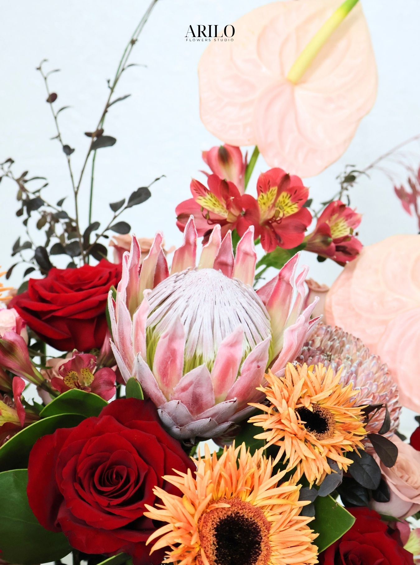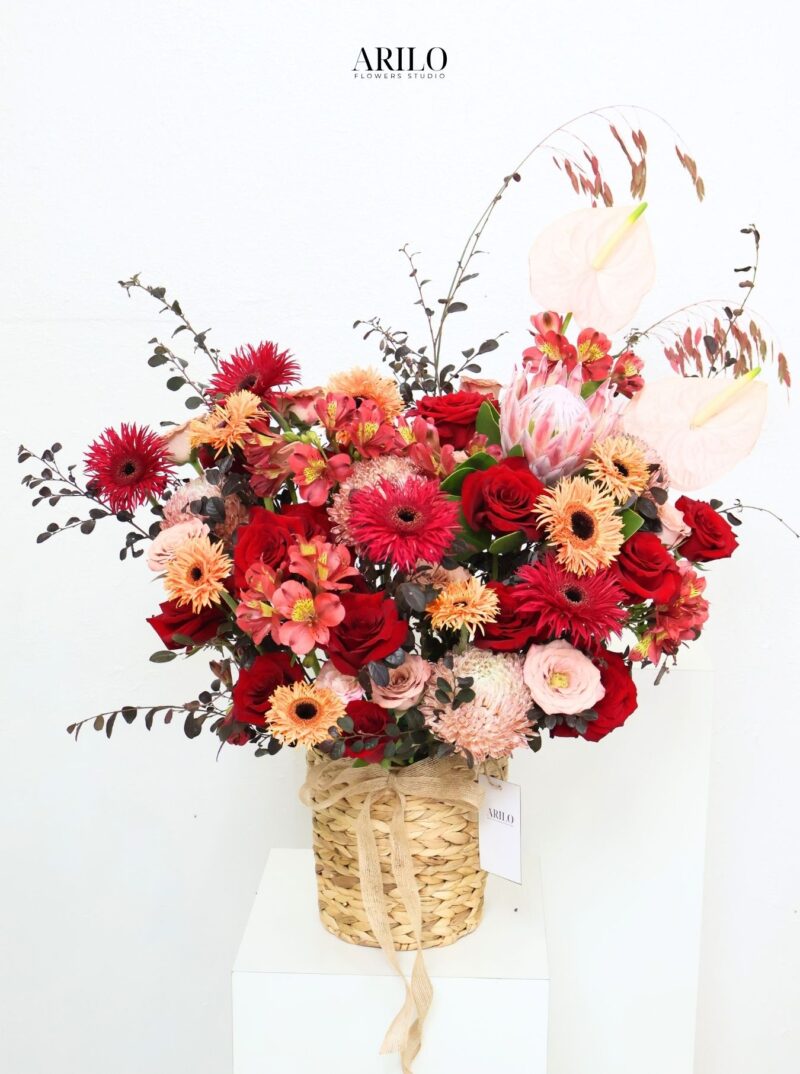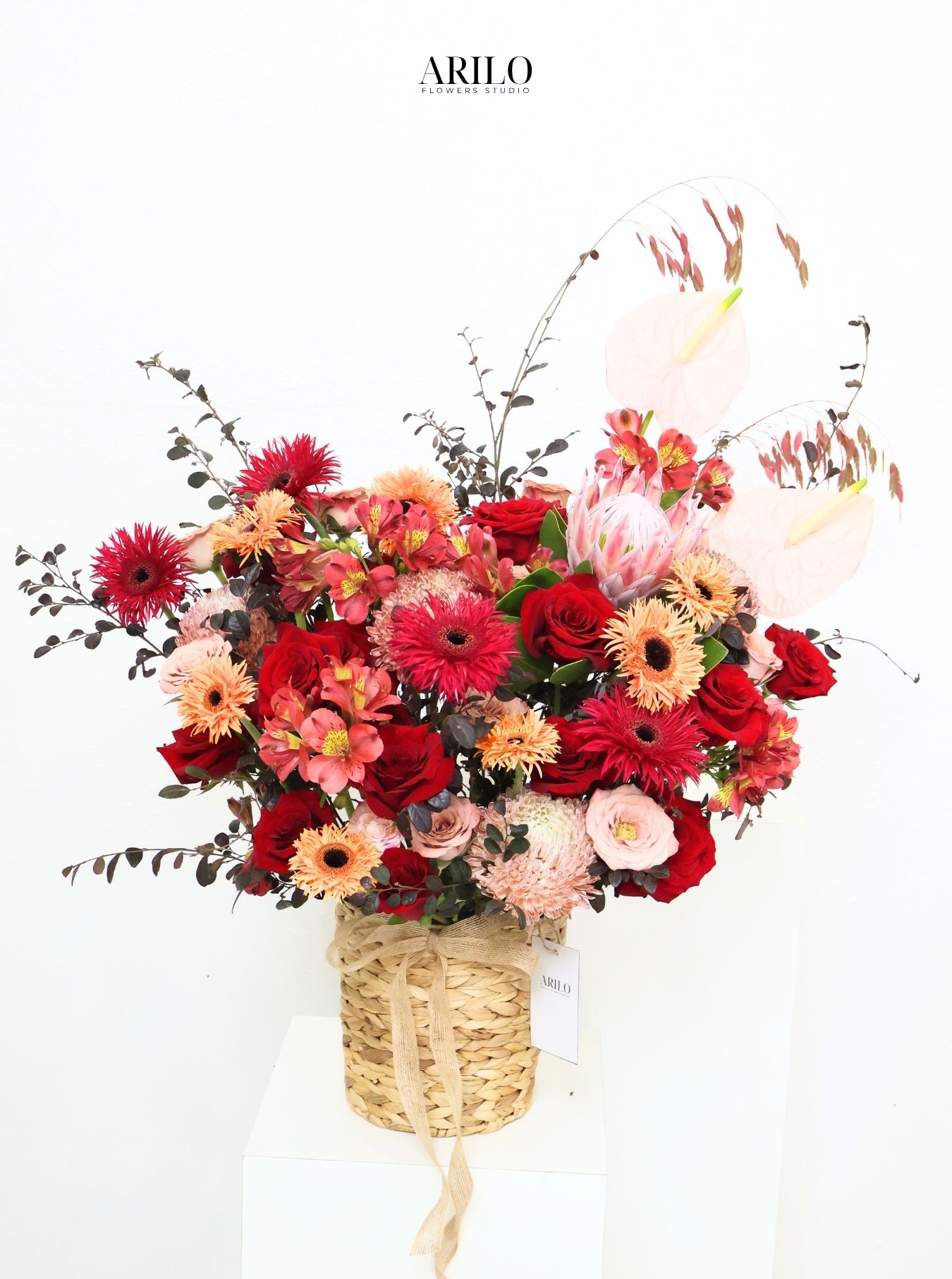 Điểm đặc biệt của giỏ hoa nằm ở cách phối màu hài hòa giữa các gam màu nóng. Sắc đỏ được sử dụng làm nền, trong khi sắc cam và hồng nhạt được thêm vào để tạo sự cân bằng. Hoa thảo đường hoàng đế với hình dáng độc đáo được đặt ở vị trí trung tâm, thu hút ánh nhìn và tạo điểm nhấn. Các chi tiết như lá xanh đậm và cành phụ được sử dụng để làm dịu tổng thể, giúp giỏ hoa không bị quá rực rỡ mà vẫn giữ được sự tinh tế. Bố cục bất đối xứng tạo nên sự tự nhiên và nghệ thuật, phù hợp với xu hướng cắm hoa hiện đại.