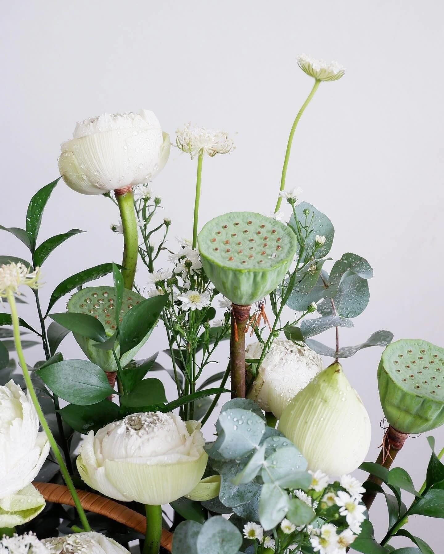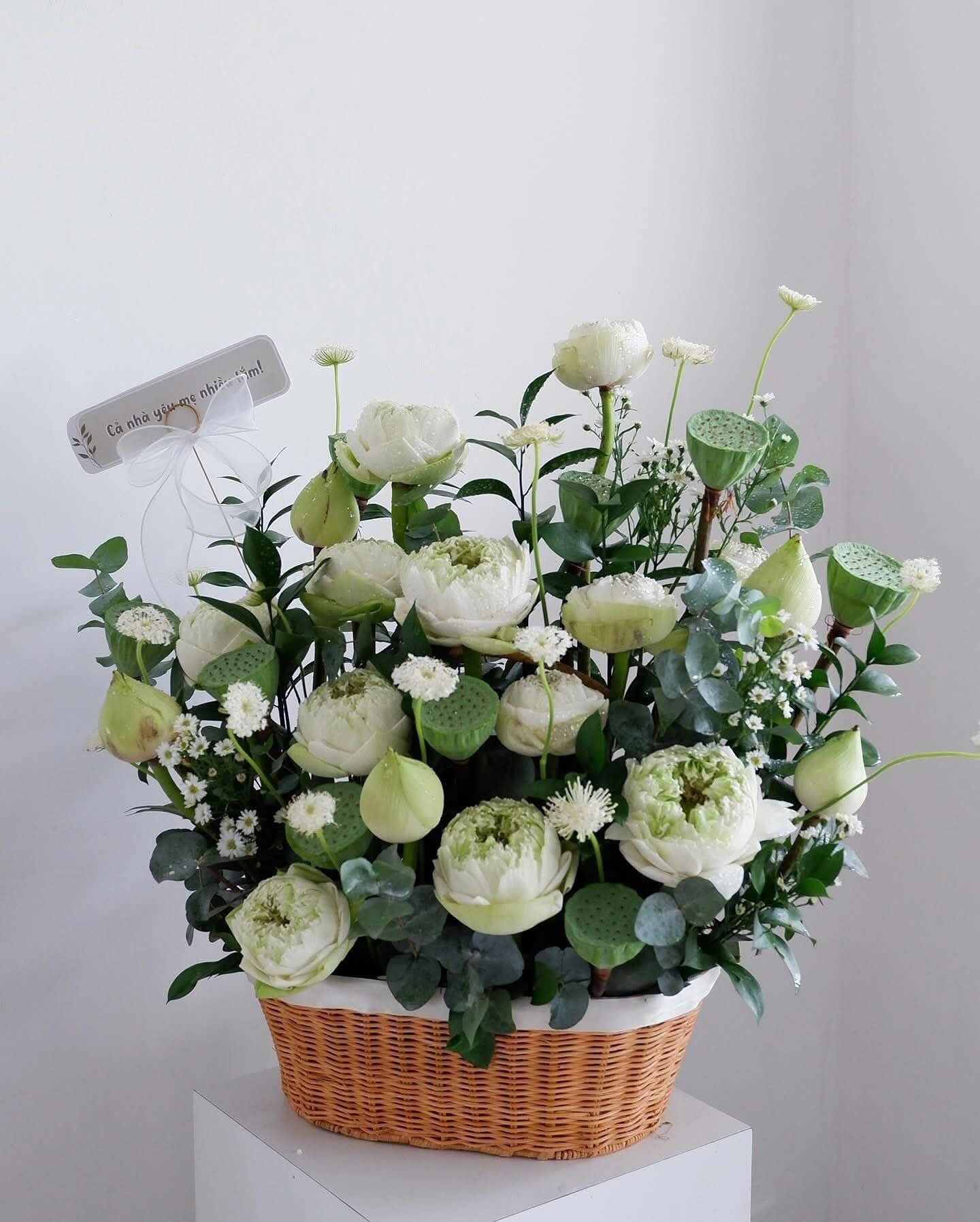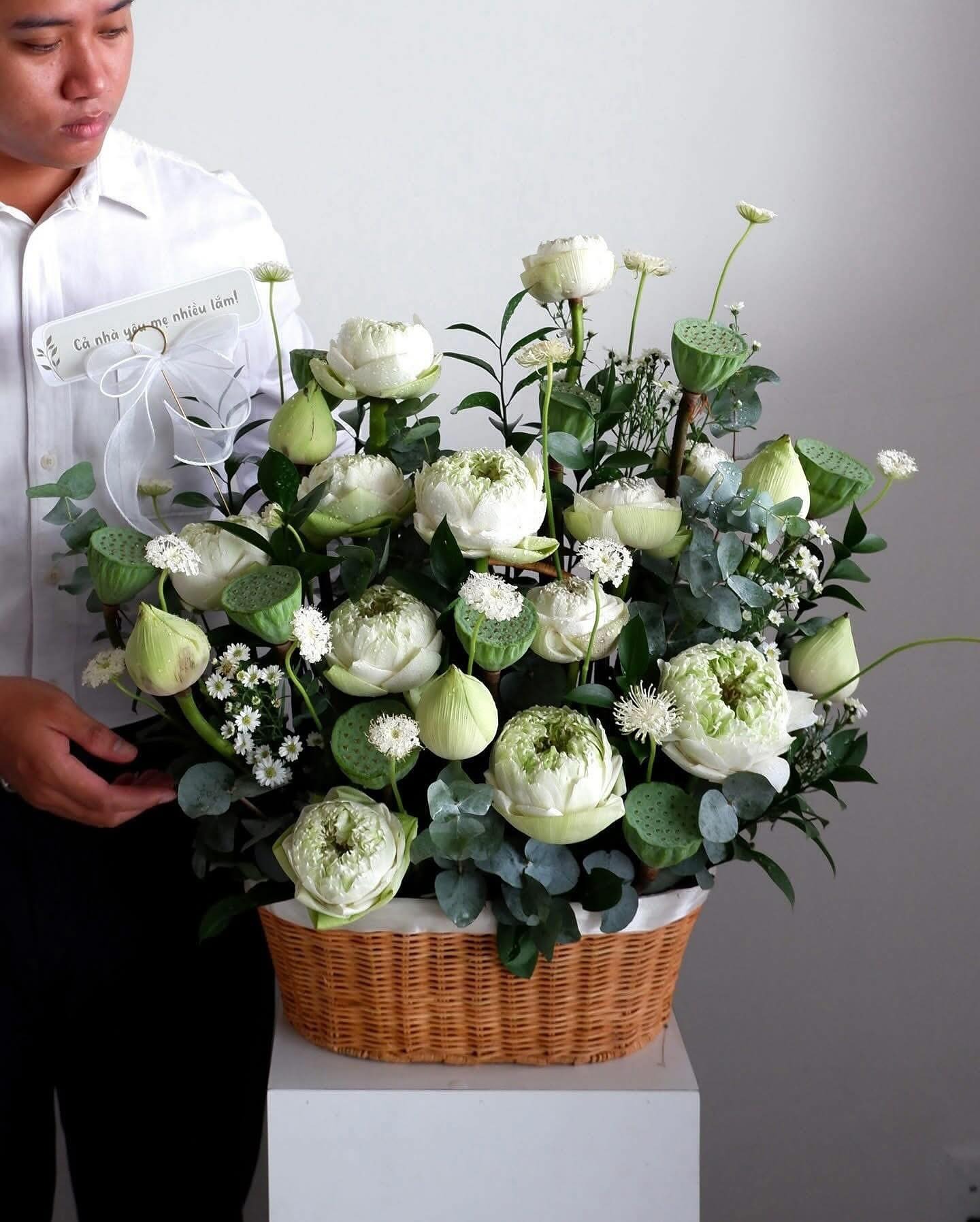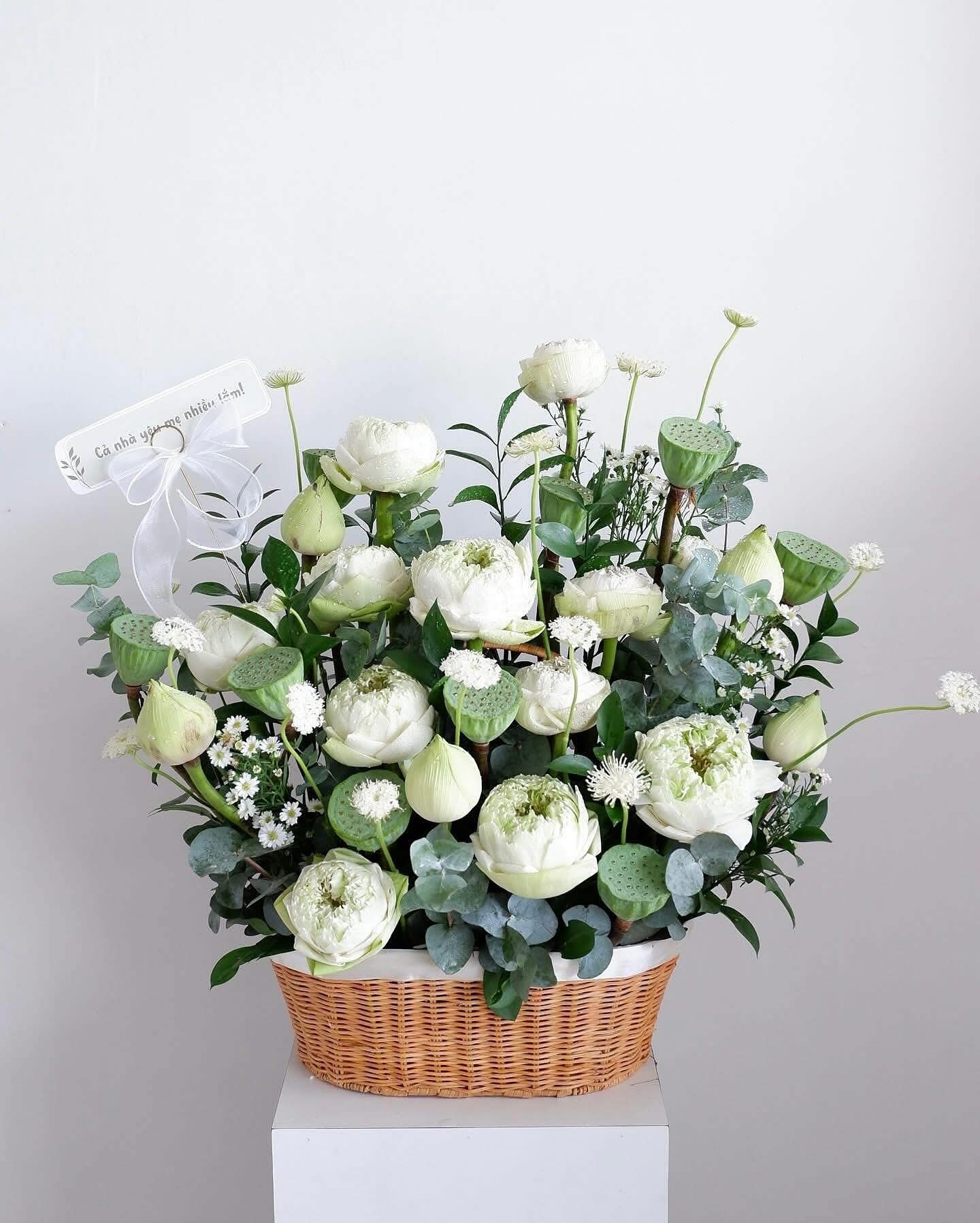 Giỏ hoa mang sắc trắng chủ đạo của sen và hoa lá phối xanh, tạo nên một tổng thể nhẹ nhàng, tinh khôi và đầy chiều sâu. Những bông sen trắng nở vừa độ, xen kẽ nụ sen, đài sen và hoa phụ nhỏ xinh, gợi cảm giác bình yên, trang nhã và rất dễ tạo thiện cảm. Thiết kế giỏ mây tự nhiên giúp tổng thể trở nên gần gũi nhưng vẫn giữ được nét sang trọng, phù hợp với nhiều không gian khác nhau.