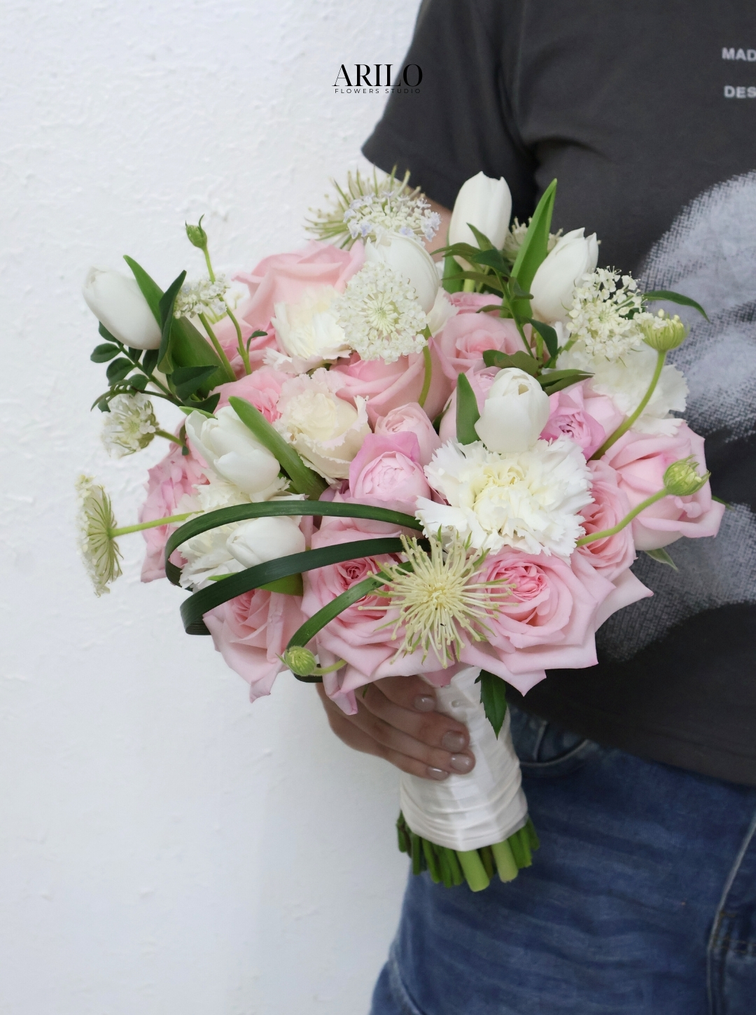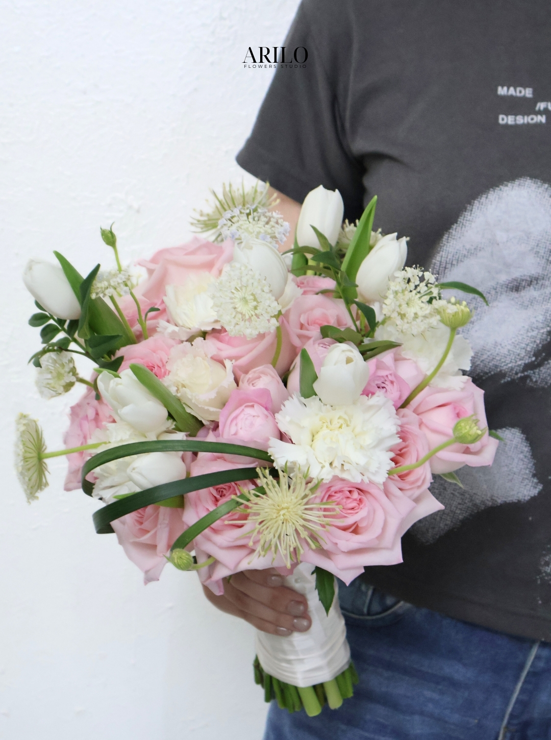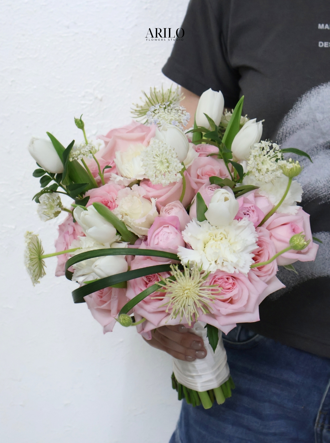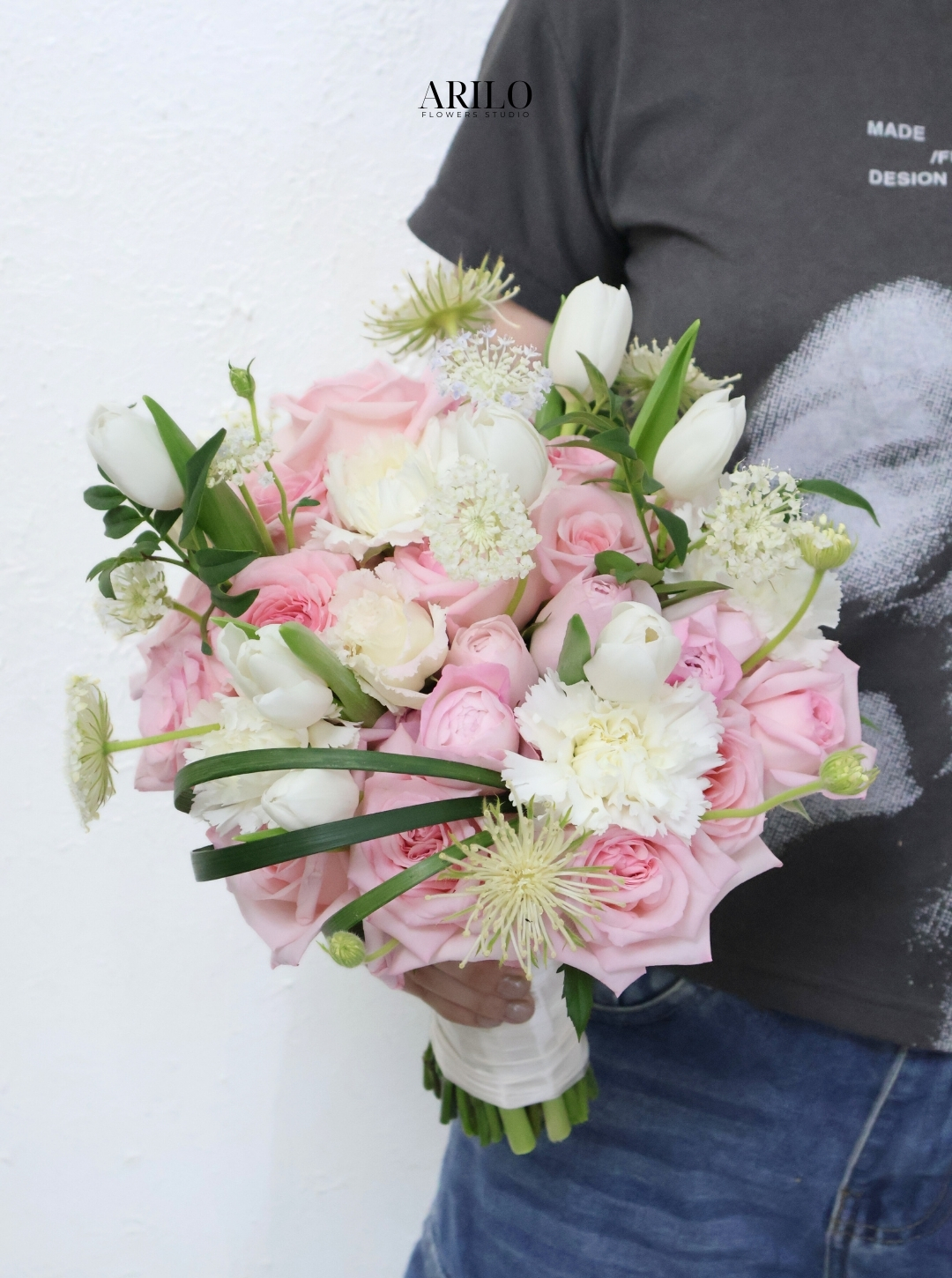 Mẫu hoa cưới tone hồng – trắng mang vẻ đẹp nhẹ nhàng, thanh thoát nhưng vẫn đầy cuốn hút. Sự kết hợp giữa hồng pastel mềm mại, tulip trắng tinh khôi và các loài hoa điểm nhỏ tạo nên tổng thể hài hòa, sang trọng. Thiết kế dáng tròn tự nhiên, phần tay cầm quấn ruy băng trắng gọn gàng giúp bó hoa thêm tinh tế và dễ cầm trong suốt buổi lễ. Đây là mẫu hoa cầm tay cô dâu phù hợp cho phong cách cưới hiện đại, tối giản hoặc tiệc cưới ngoài trời. Sản phẩm được thiết kế thủ công tại shop hoa tươi Sài Gòn Arilo Flower Studio, đảm bảo hoa tươi mới và form dáng chuẩn chỉnh cho ngày trọng đại.