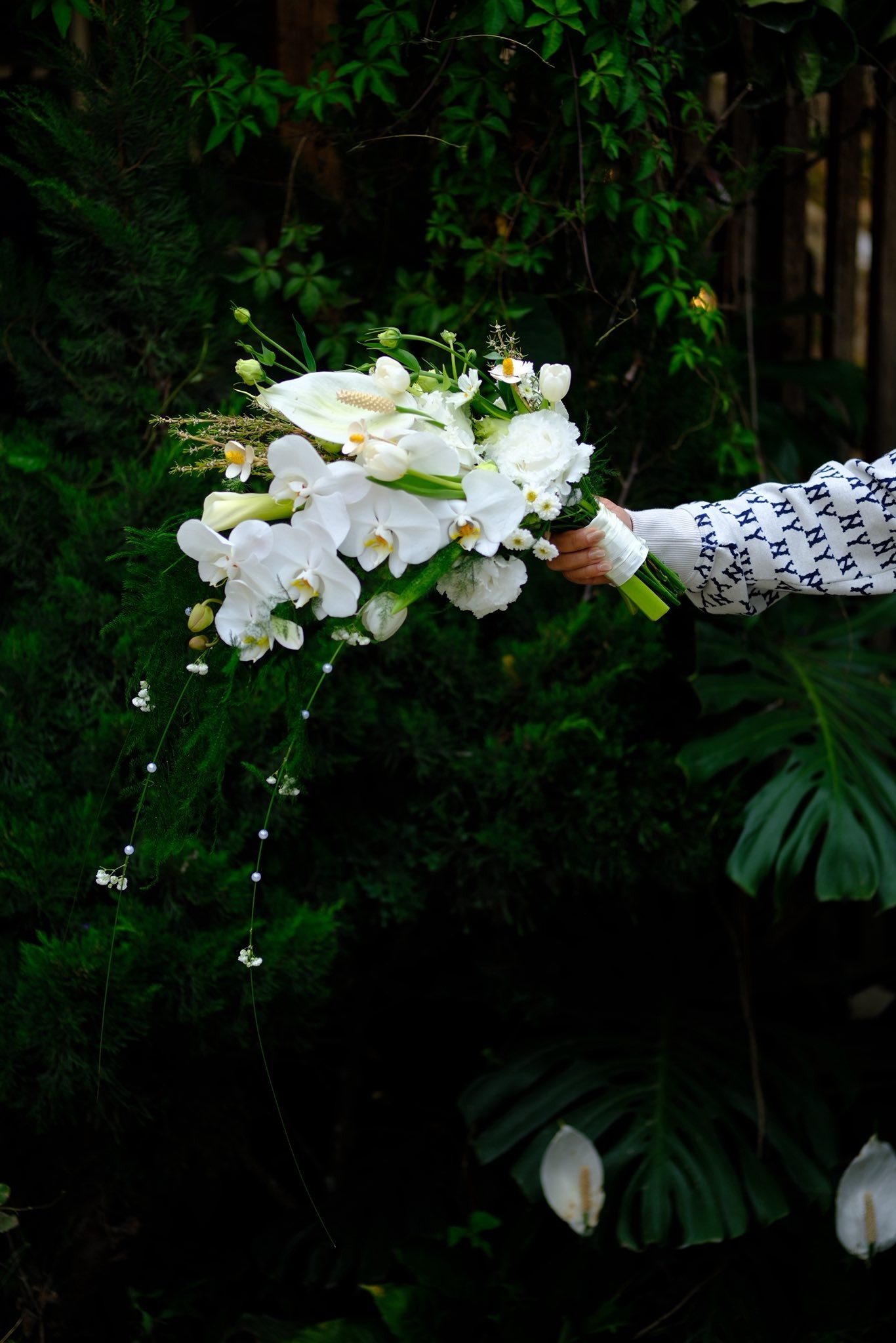 Điểm đặc biệt của bó hoa này nằm ở thiết kế dáng rủ mềm mại. Những cành lá dài và hoa rủ xuống tự nhiên tạo nên hiệu ứng chuyển động nhẹ nhàng khi cô dâu cầm bó hoa.