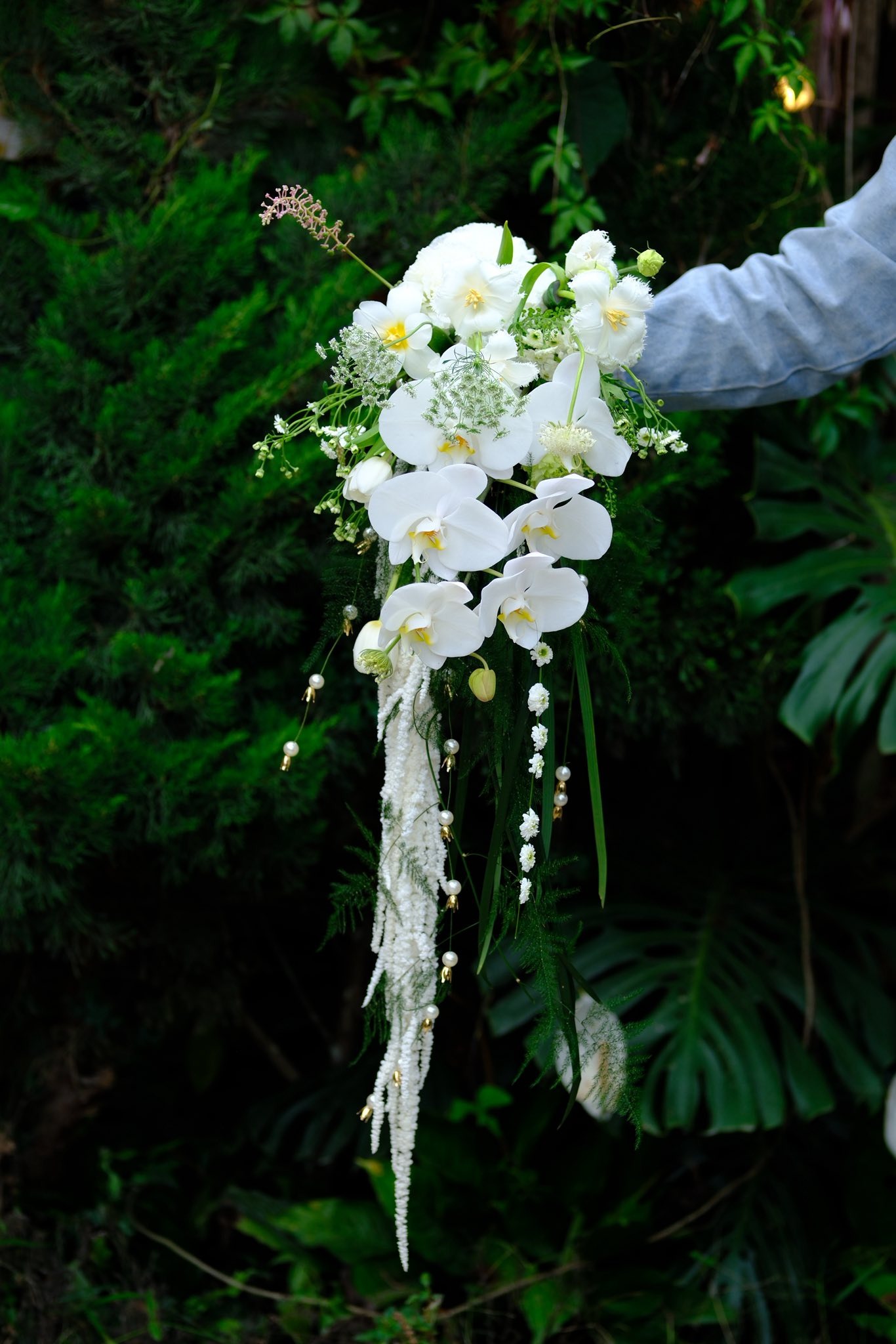 Mỗi bó hoa cưới cầm tay đều mang theo một thông điệp riêng, và bó hoa lan hồ điệp trắng này tượng trưng cho tình yêu thuần khiết và sự gắn bó lâu dài.