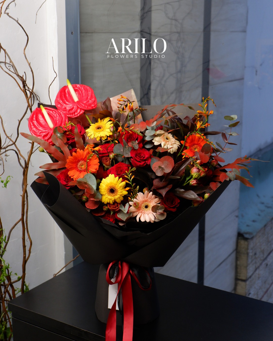 Dưới bàn tay khéo léo của nghệ nhân Arilo, bó hoa không chỉ là sự kết hợp của những đóa hoa mà là một tác phẩm nghệ thuật. Chúng tôi sử dụng giấy gói Hàn Quốc cao cấp (như giấy mờ, giấy lụa) với tông màu trang nhã (ví dụ: kem, xám khói, đen tuyền) làm nổi bật vẻ đẹp kiêu sa của hoa hồng. Điểm nhấn là chiếc nơ lụa mềm mại được thắt thủ công, tạo nên một tổng thể sang trọng và hiện đại.