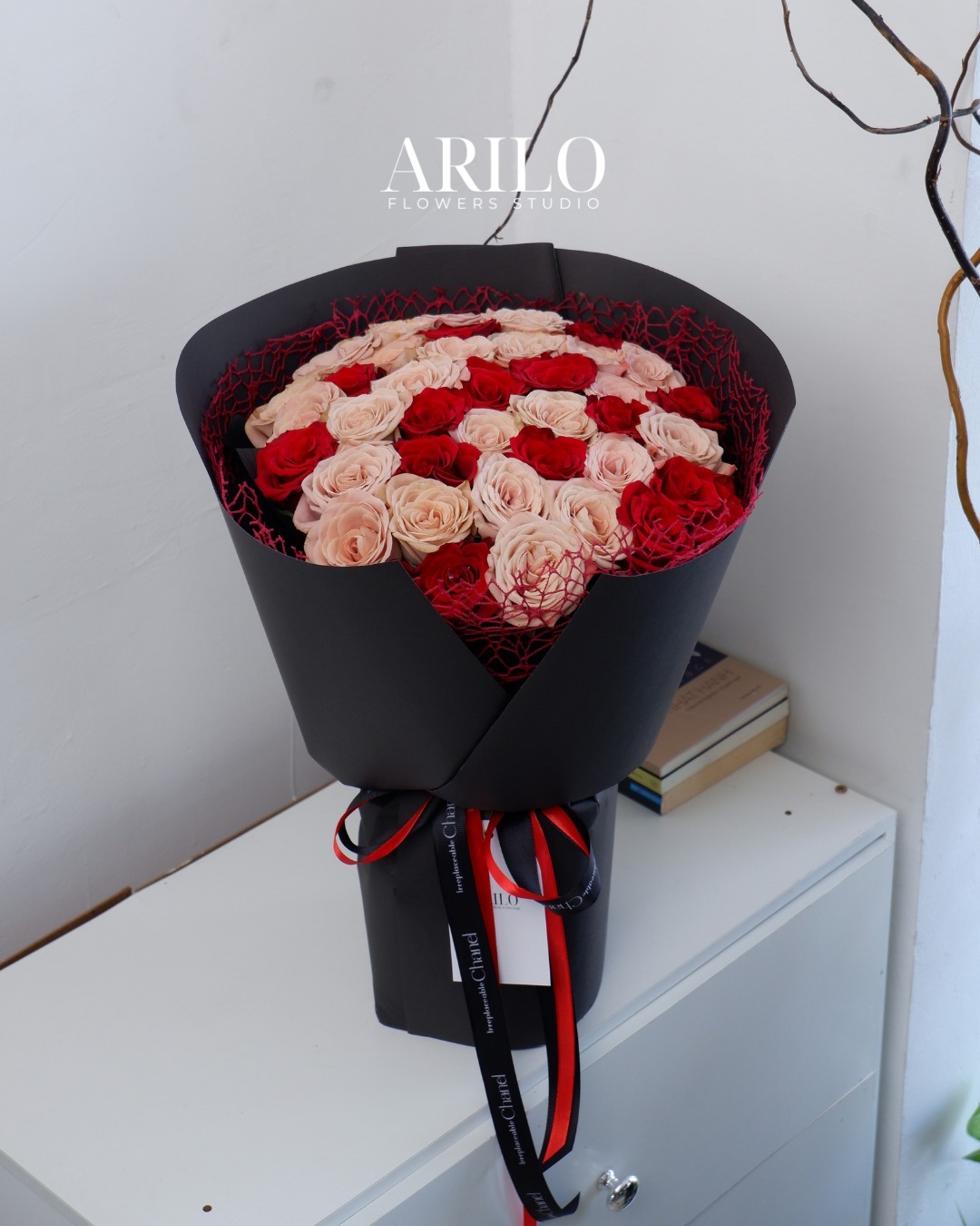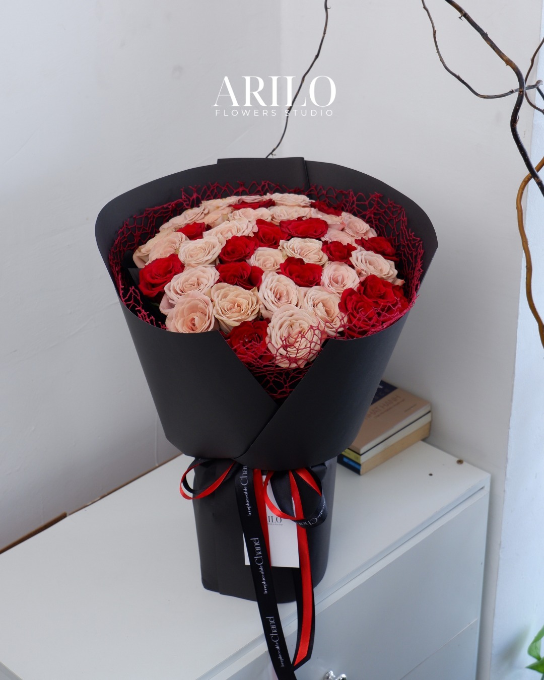 Bó hoa được Arilo thiết kế theo phong cách hiện đại, sử dụng giấy gói đen cao cấp kết hợp lưới đỏ trang trí bên trong. Sự tương phản giữa gam tối của giấy gói và sắc hoa nổi bật giúp từng bông hồng trở nên rõ nét, sang trọng và cuốn hút ngay từ ánh nhìn đầu tiên. Thiết kế này đặc biệt phù hợp với không khí của Valentine, nơi cảm xúc cần được thể hiện một cách rõ ràng nhưng vẫn đầy tinh tế.
