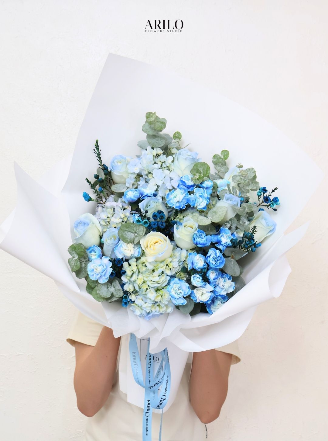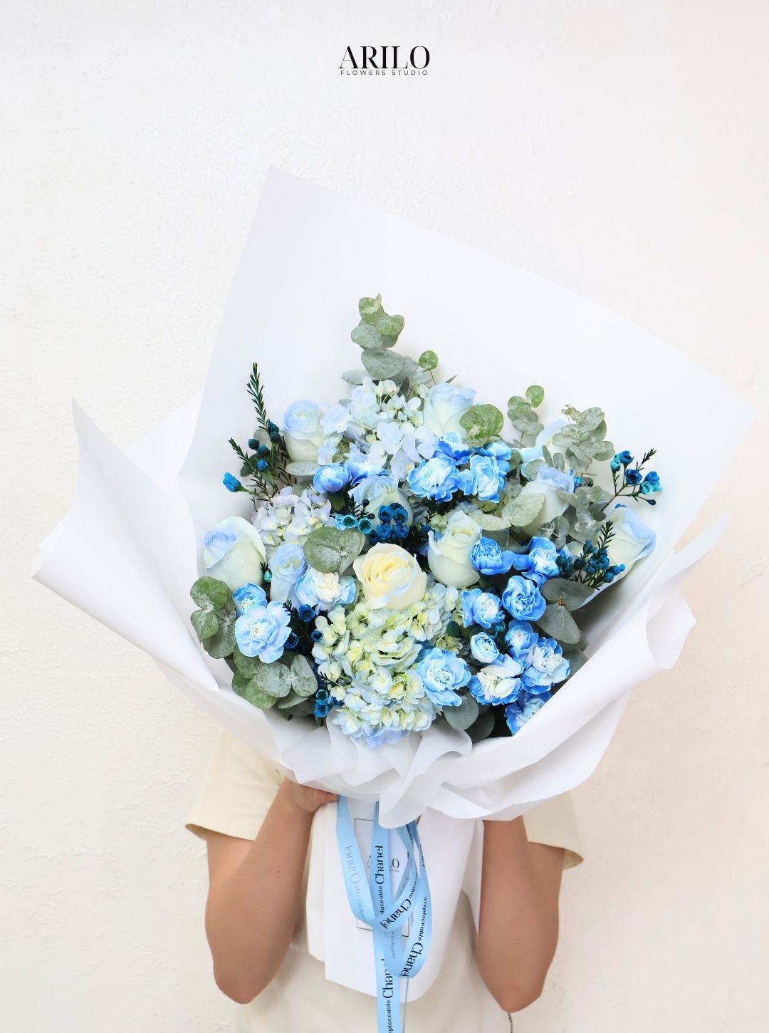 Sự phối màu xanh – trắng mang lại cảm giác dịu mắt, thanh lịch và rất phù hợp với những mối quan hệ yêu thương trưởng thành. Đây là bó hoa tặng người yêu Valentine dành cho những ai muốn gửi đi thông điệp yêu một cách kín đáo nhưng đủ sâu, đủ lâu. Không cần những lời hoa mỹ, bó hoa tự thân đã kể câu chuyện về sự đồng hành, thấu hiểu và bền vững.