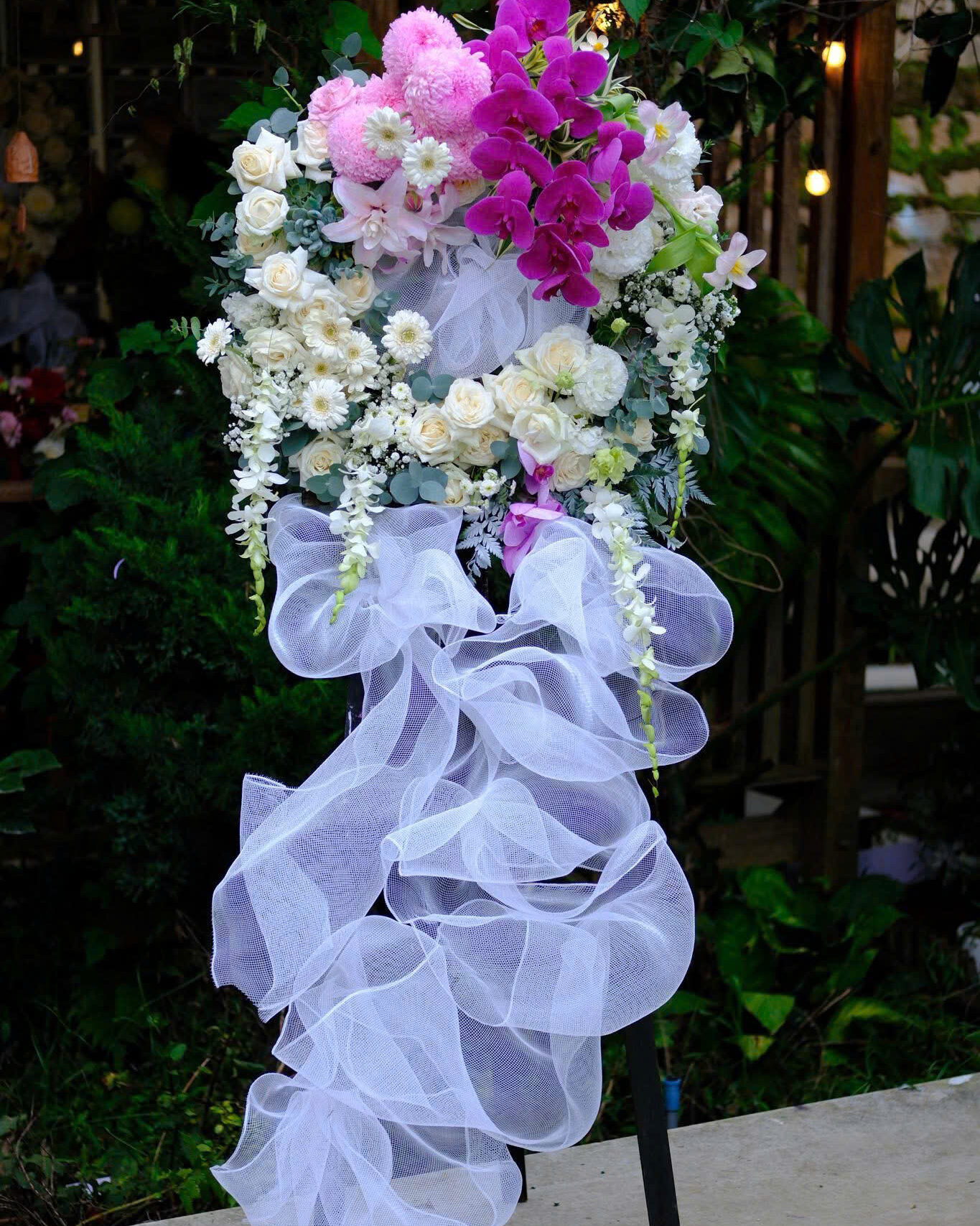 Lớp voan trắng được xử lý mềm mại, buông nhẹ phía dưới như một dòng cảm xúc kéo dài. Chi tiết này không chỉ tăng tính thẩm mỹ mà còn mang lại cảm giác thanh thoát, giúp kệ hoa không bị nặng nề.