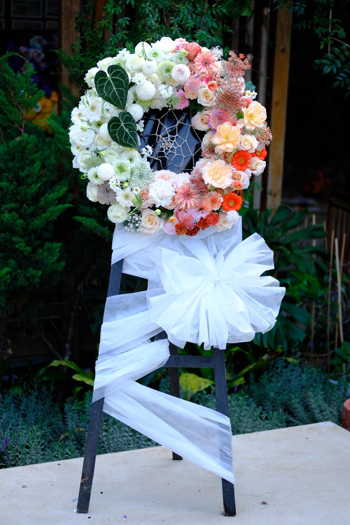 Thiết kế vòng hoa kết hợp cùng phần voan trắng phía dưới mang đến sự mềm mại, giúp tổng thể không bị nặng nề. Đây là lựa chọn phù hợp với nhiều không gian tang lễ khác nhau. Nếu bạn đang tìm kệ hoa tang lễ giá tốt, đây là mẫu hoa đáng cân nhắc. Với dịch vụ kệ hoa viếng giao nhanh quận 3 shop hoa tươi sài gòn, bạn có thể hoàn toàn yên tâm. Shop hoa tươi sài gòn Arilo Flower Studio luôn đồng hành để giúp bạn gửi trọn sự sẻ chia.