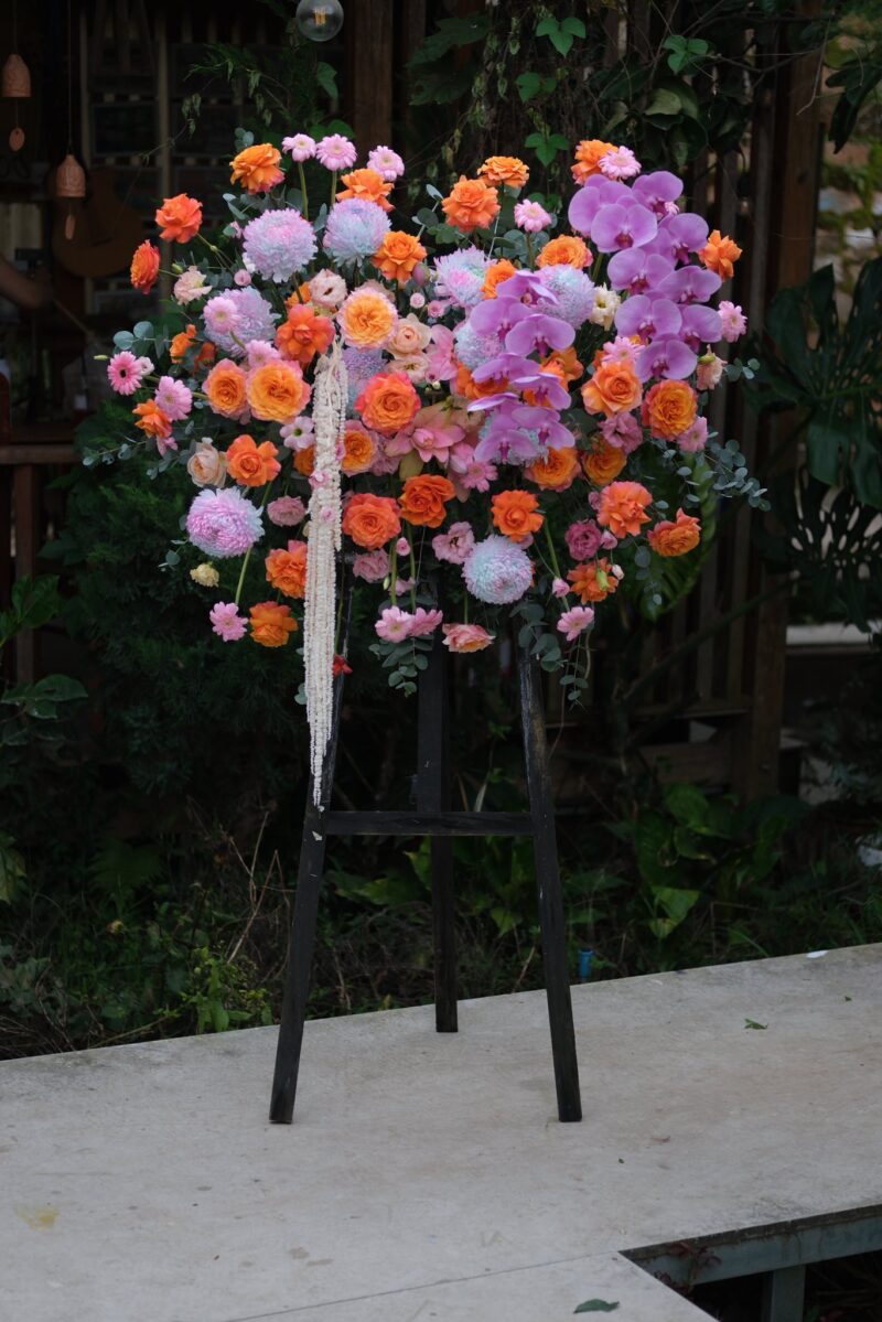 Kệ hoa khai trương trong hình là một thiết kế nổi bật với gam màu ấm áp và đầy sức sống. Sự kết hợp giữa sắc cam, hồng và tím tạo nên một tổng thể vừa rực rỡ vừa mềm mại, mang lại cảm giác dễ chịu nhưng vẫn đủ nổi bật để thu hút ánh nhìn.