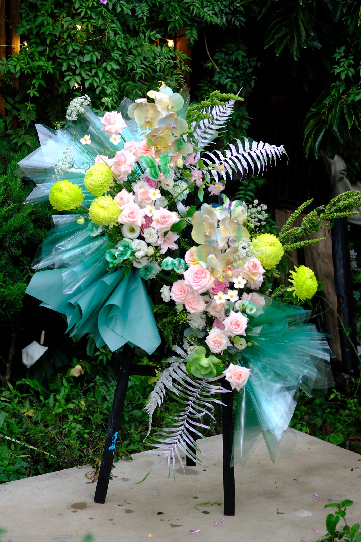 Sự kết hợp giữa sắc xanh ngọc và hồng pastel mang đến cảm giác nhẹ nhàng, thanh lịch nhưng vẫn nổi bật. Các chi tiết như lá dương xỉ, hoa lan và hoa hồng được phối hợp khéo léo, tạo nên một thiết kế vừa tự nhiên vừa có tính nghệ thuật cao. Đây là mẫu kệ hoa khai trương phù hợp với những không gian yêu cầu sự tinh tế như showroom, spa hoặc cửa hàng cao cấp.