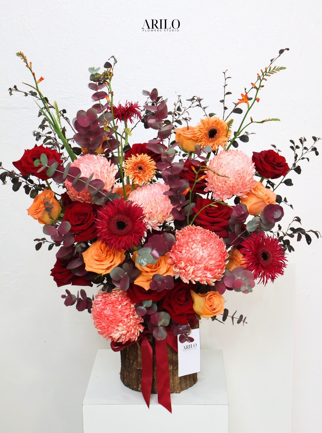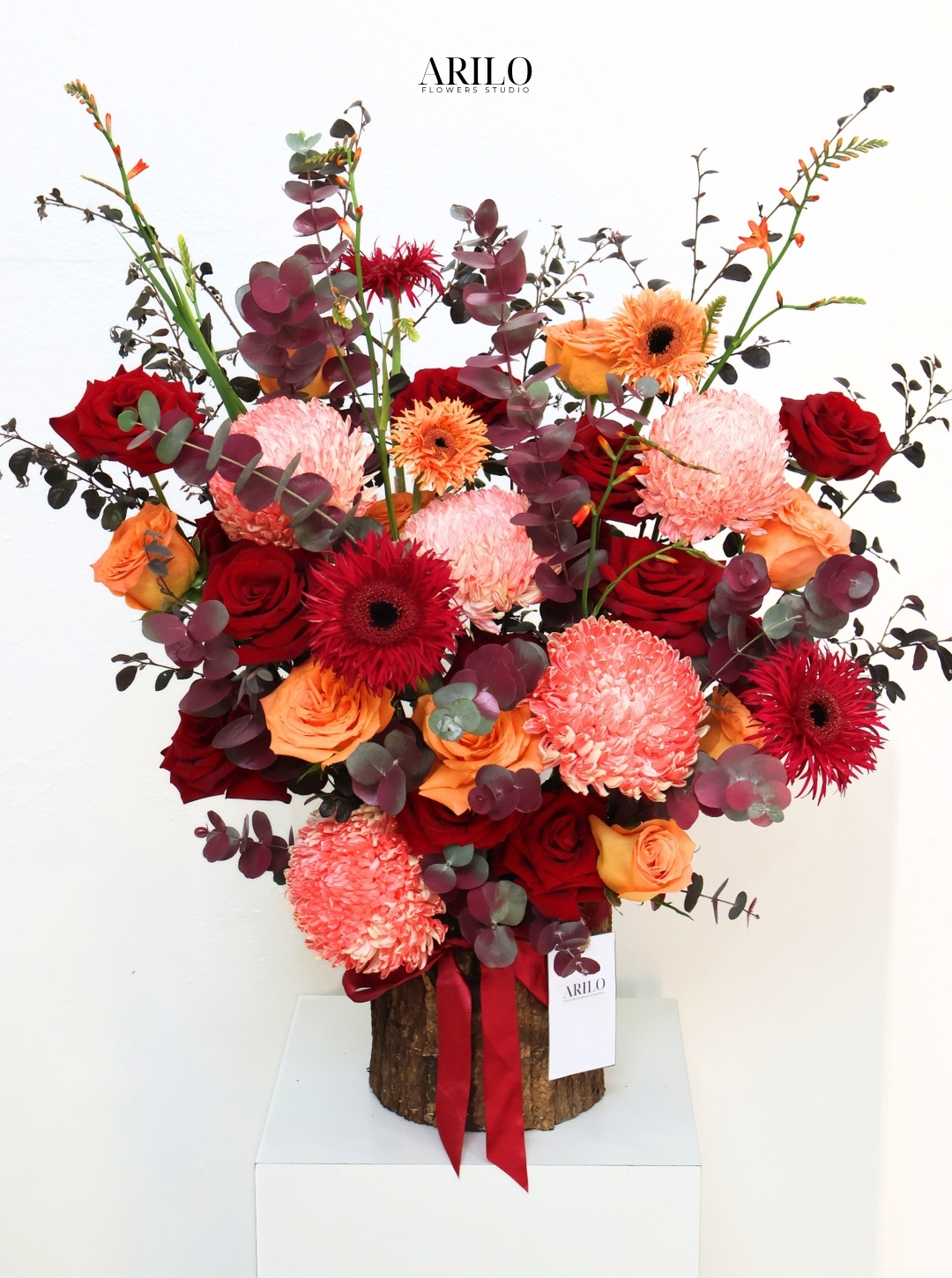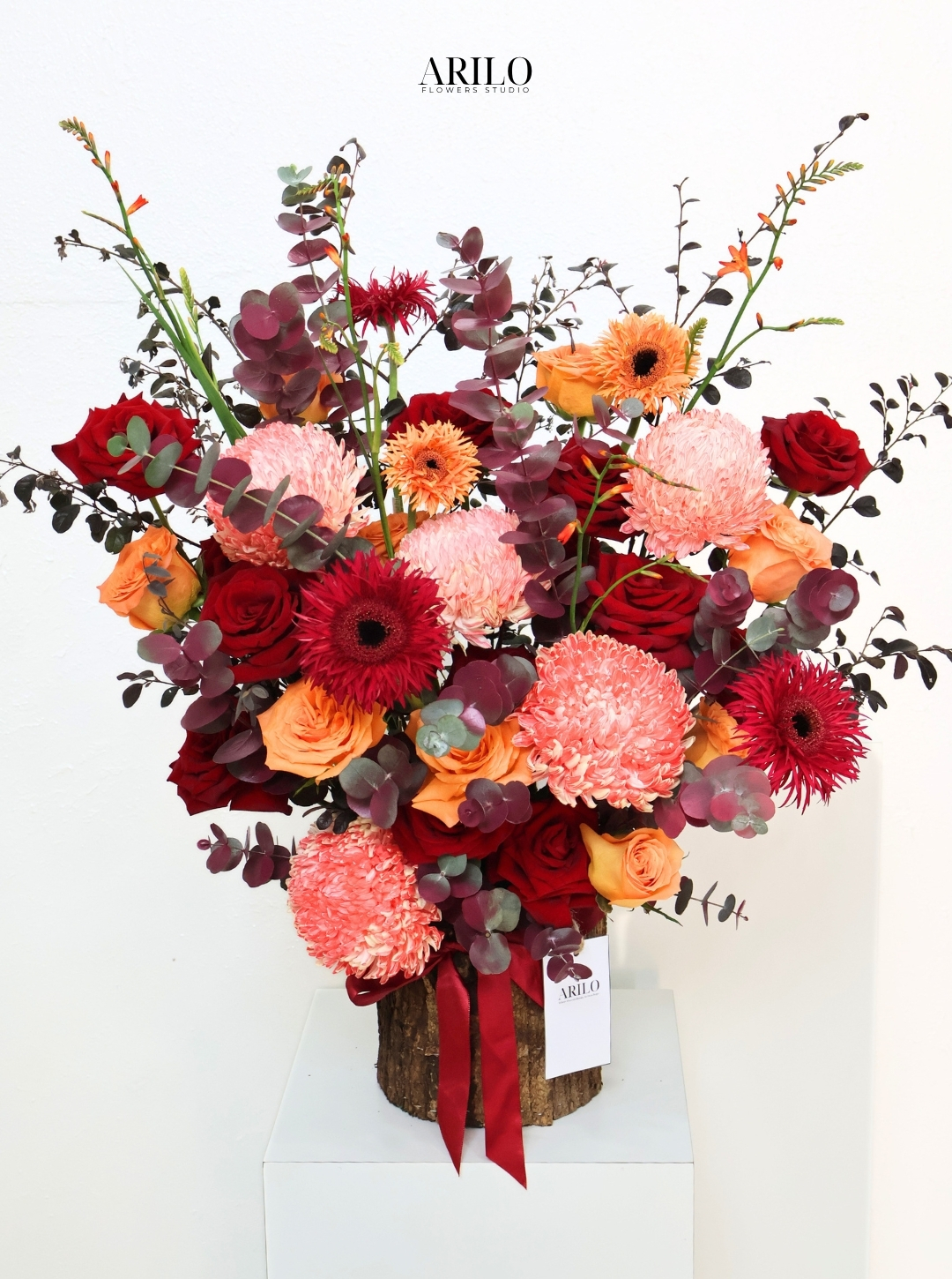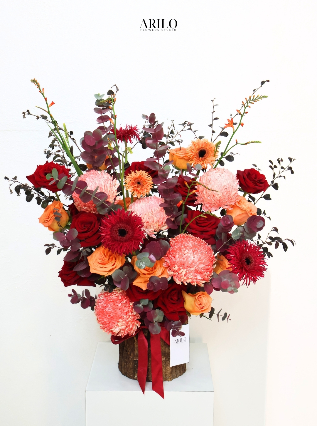 Sự hòa quyện giữa sắc đỏ nồng nàn và cam ấm áp tạo nên một tổng thể cuốn hút ngay từ ánh nhìn đầu tiên. Mẫu lãng hoa chúc mừng này nổi bật với hoa hồng đỏ, hồng cam, cúc pingpong và đồng tiền đỏ, kết hợp cùng lá eucalyptus mang tông trầm hiện đại. Từng chi tiết được sắp xếp khéo léo, tạo nên một bố cục cân đối nhưng vẫn đầy chuyển động.