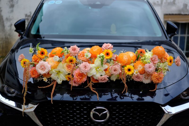 Một chiếc xe cưới đẹp là khi nó khiến người ta cảm nhận được niềm vui ngay từ ánh nhìn đầu tiên. Mẫu xe cưới cô dâu này sử dụng bảng màu cam đào chủ đạo, kết hợp cùng vàng tươi và trắng nhẹ, tạo nên cảm giác ấm áp và hạnh phúc. Những bông hoa được sắp xếp theo phong cách tự nhiên, có điểm rủ nhẹ, giúp tổng thể trở nên mềm mại hơn.