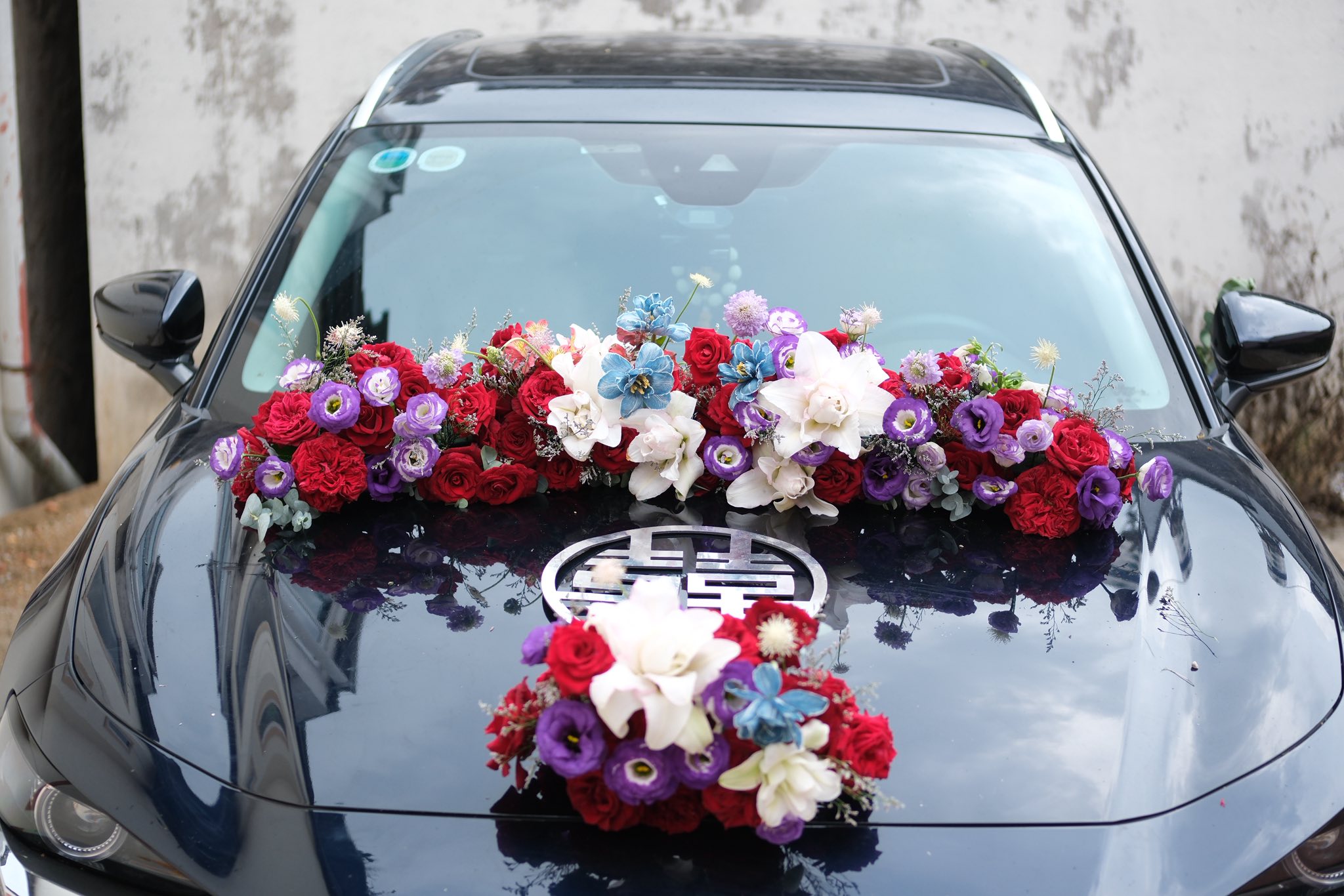 Một chiếc xe cưới đẹp không chỉ cần hoa đẹp mà còn cần bố cục tinh tế. Mẫu xe cưới cô dâu này sử dụng layout hai tầng, với dải hoa chính phía sau và cụm hoa phụ phía trước, tạo nên hiệu ứng chiều sâu ấn tượng. Sự kết hợp giữa đỏ, tím và trắng giúp tổng thể vừa nổi bật vừa cân bằng.