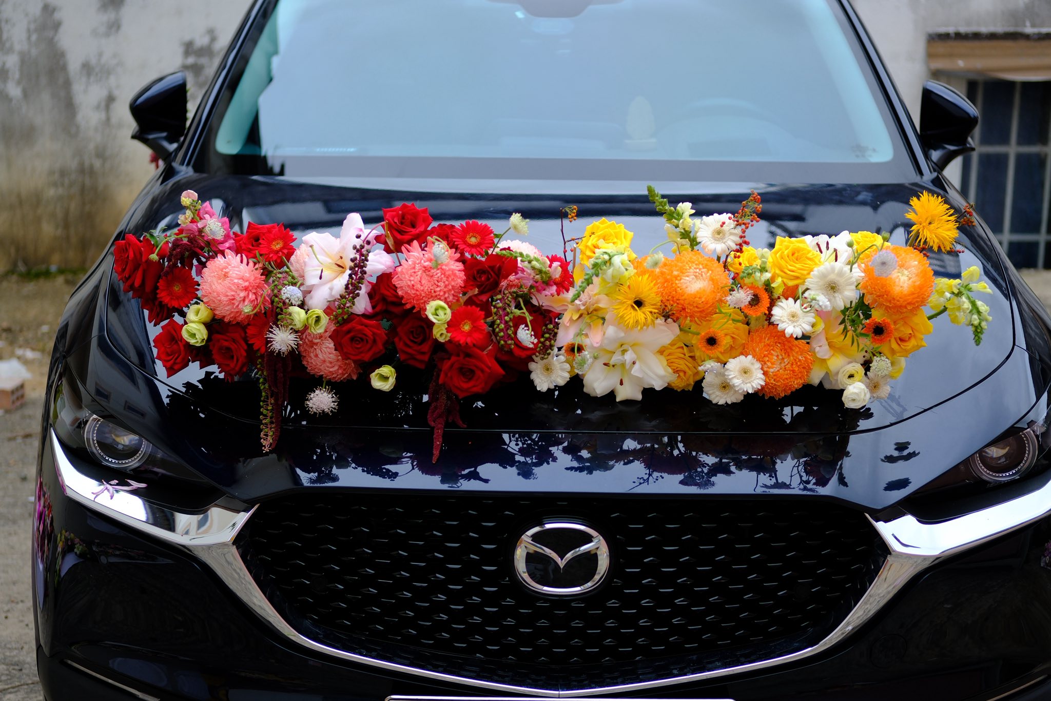 Một chiếc xe cưới đẹp là khi nó truyền tải được cảm xúc ngay từ ánh nhìn đầu tiên. Mẫu xe cưới cô dâu này sử dụng bảng màu đỏ – vàng – trắng, tạo nên tổng thể rực rỡ nhưng vẫn cân bằng. Các loại hoa được sắp xếp theo phong cách tự nhiên, có sự chuyển màu nhẹ nhàng giữa các cụm hoa, giúp tổng thể không bị rối mắt mà ngược lại rất nổi bật.